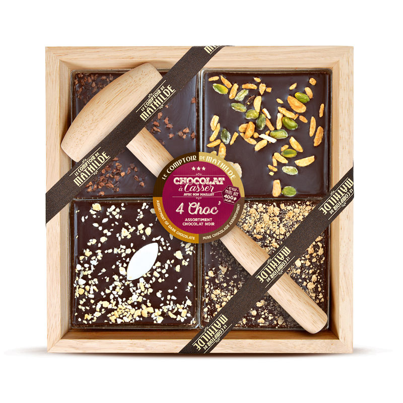 Je bent een fan van pure chocolade! Le Comptoir de Mathilde heeft “Le 4 Choc ‘” exclusief voor u gemaakt met pure chocolade. 4 repen in één met 4 verschillende smaken.